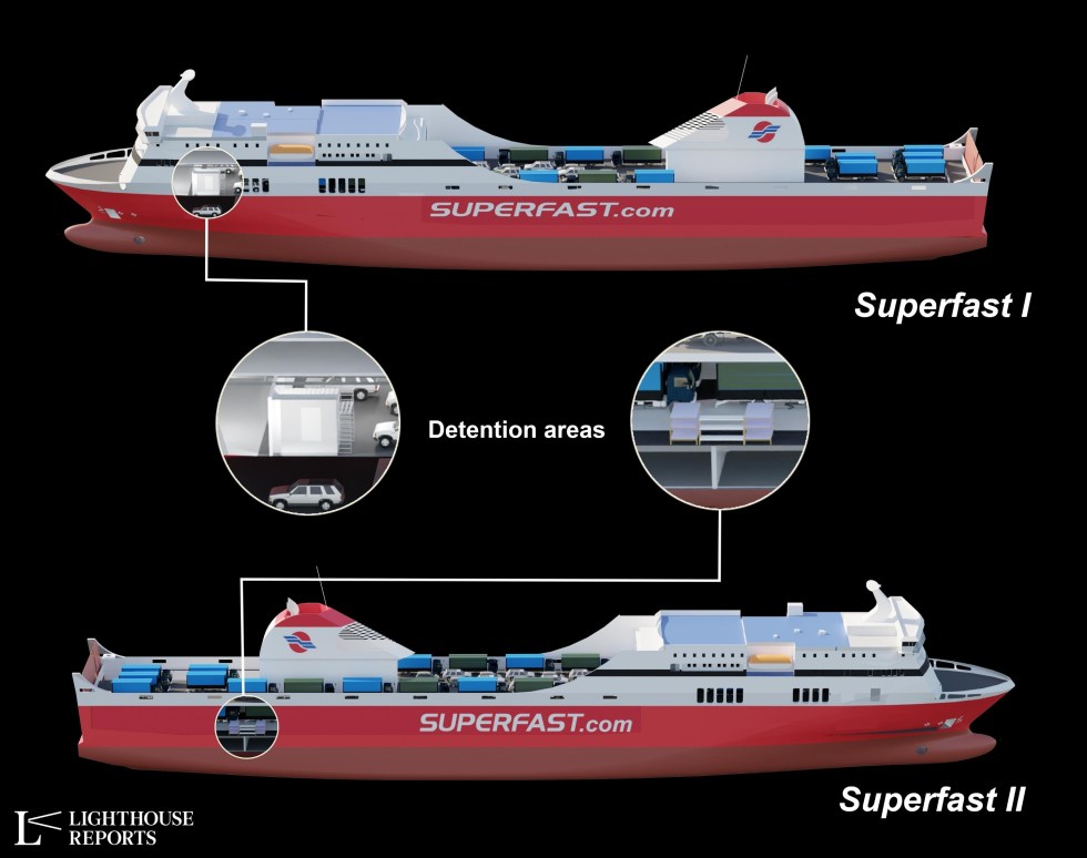 On another commercial ship, named Superfast I, people are held in a metal box with a caged roof in the garage room on one of the lower decks. It gets extremely hot here during the summer months. We visited the room and captured footage and stills. It matches the descriptions from asylum seekers. There is only a piece of cardboard on the floor. People appear to have tried to write words in the dust on the metal wall.