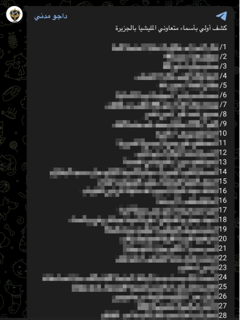 We archived 28 speeches by public officials, voice notes, and social media posts condemning all civilian residents of RSF-controlled areas as RSF collaborators or spies. Facebook groups and Telegram posts include the names of alleged RSF collaborators and encourage vigilante violence against them. Some of these accusations characterized an entire group as collaborators based on their ethnicity.