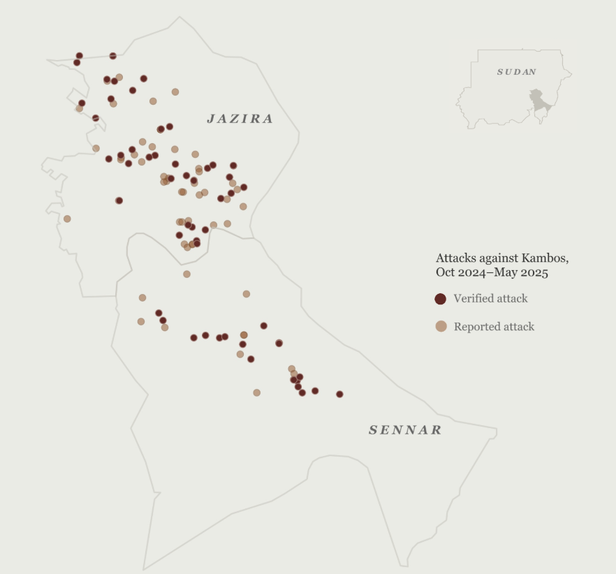 Using a combination of confidential sources, on-the-ground reporting, and open source evidence, we have confirmed a systematic pattern of mass killing and displacement perpetrated by the Sudanese Armed Forces and allied militias against Kanabi farming communities, known as kambos, in Jazira and Sinnar states.