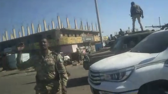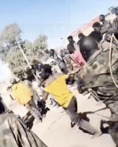 In this video, geolocated to a residential neighborhood in Madani, a group of uniformed soldiers detain a group of men in civilian clothing at gunpoint. A soldier shouts at his colleagues and encourages them to punish the detainees based on their appearance. Another group of detainees sit in the back of a pickup truck.