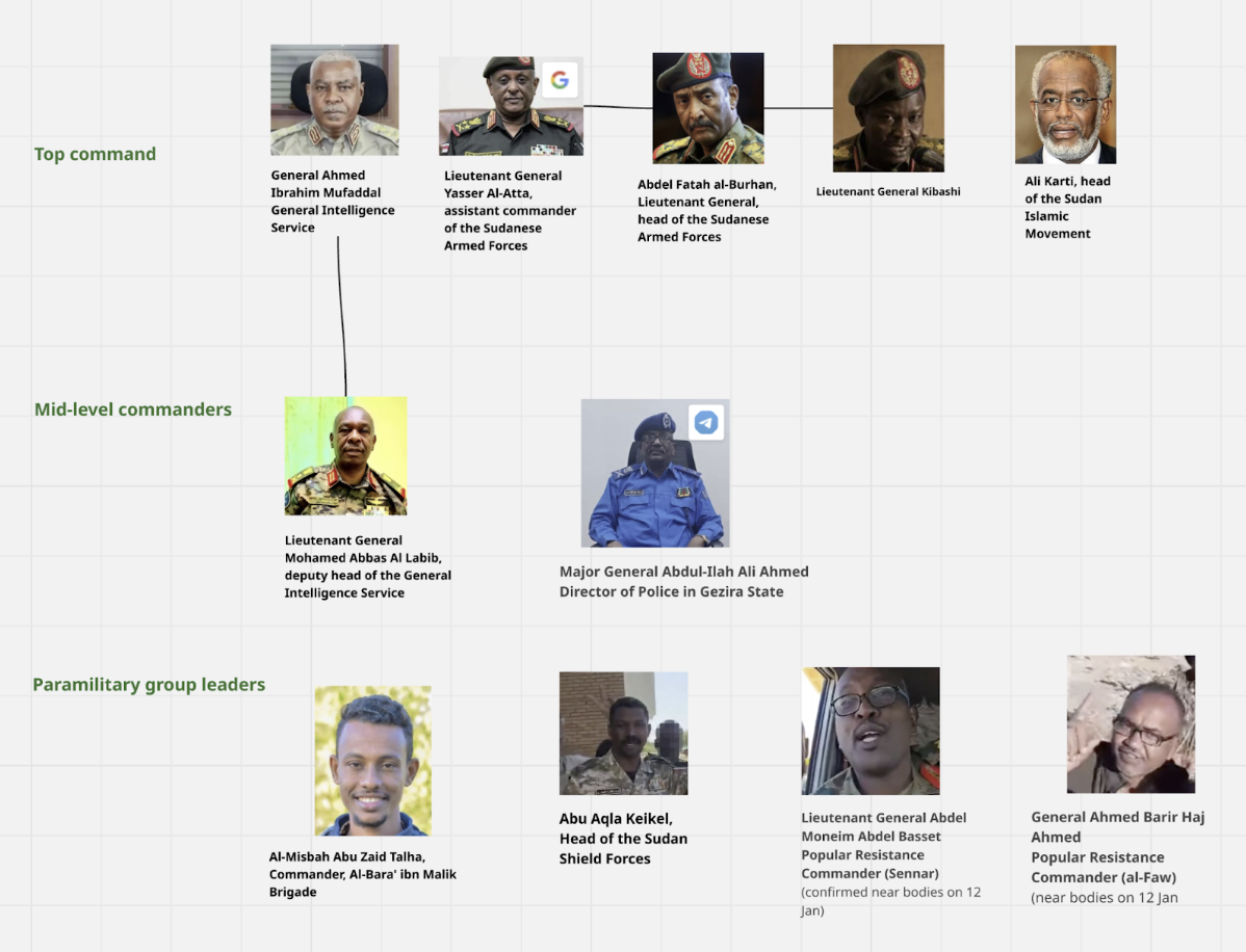 These killings were conducted with the knowledge and support of high-ranking officers in the Sudanese Armed Forces, General Intelligence Service, and allied militias including the Sudan Shield Forces and al-Baraa bin Malik Brigades.