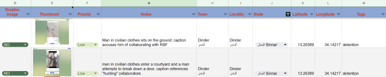 After we narrowed our focus to Jazira state during mid-January, colleagues at the Center for Information Resilience graciously shared their data corresponding to our geographic area of interest and time frame, including geolocation notes and degree of verification. (We treated their geolocations as leads to be confirmed independently.)